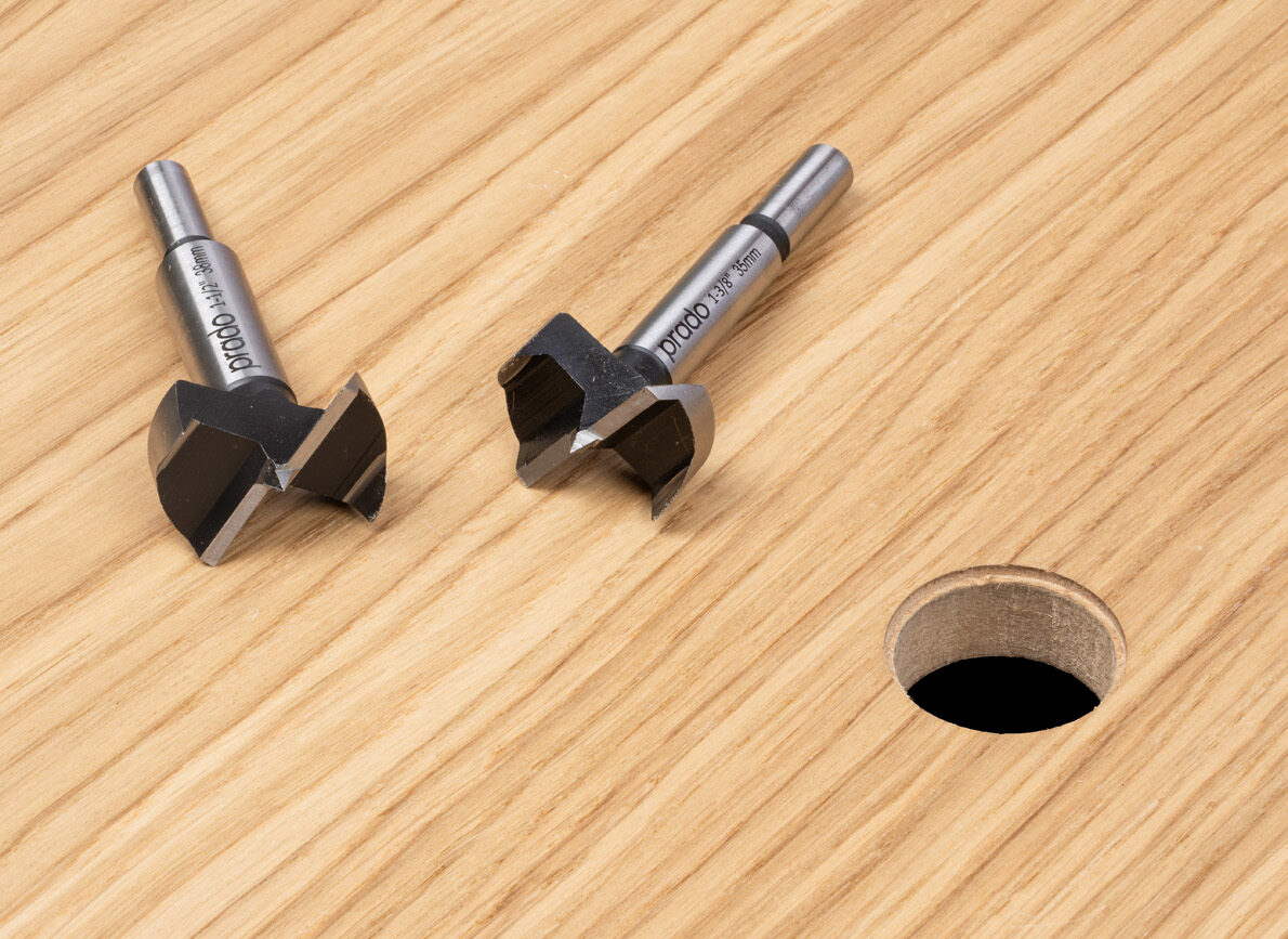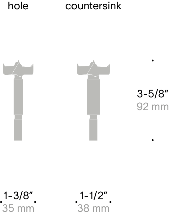 Made for unifit series single. Creates clean, flat-bottom holes in wood. Ideal for furniture, cabinetry, and architectural joinery. Surface installation requires a 1-3/8” (Ø35 mm) bit. For flush mounting, first use a 1-1/2” (Ø38 mm) bit to create the countersink, then a 1-3/8” (Ø35 mm) bit for the hole.